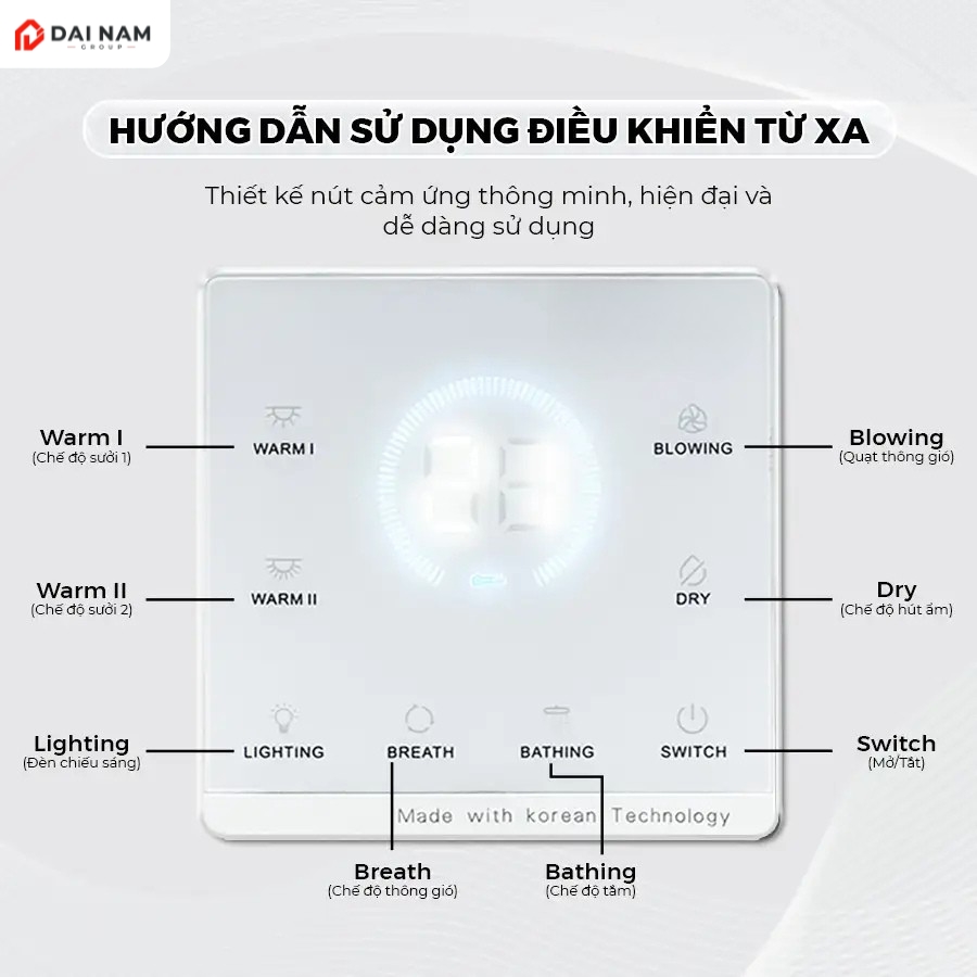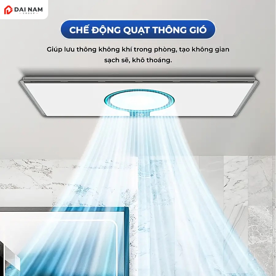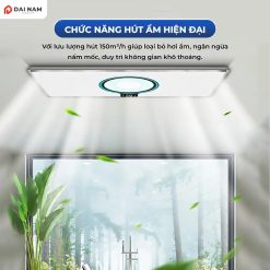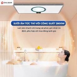 | Tiện ích | – Tổng công suất: 2800W. – Sưởi ấm: 1350W. – Đèn LED chiếu sáng: 24W. – Làm khô/quạt mát: 40W. – Thông gió/hút âm: 40W (lưu lượng hút 170m³/h). |