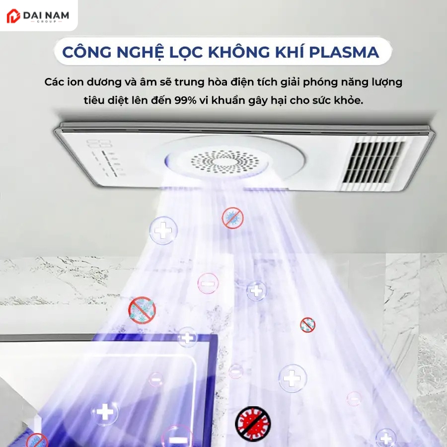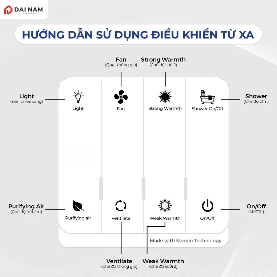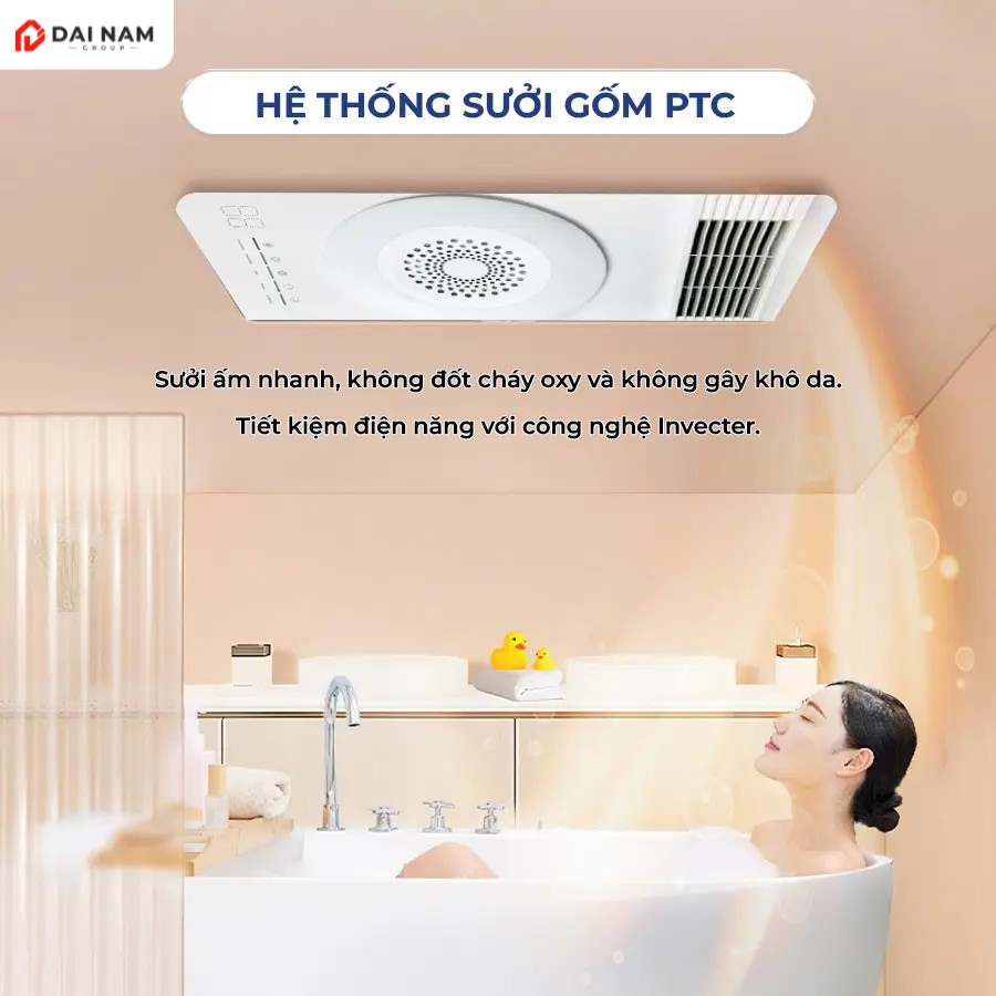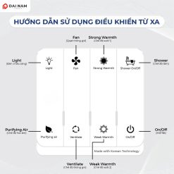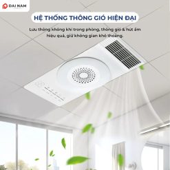 | Tiện ích | – Tổng công suất: 2600W. – Sưởi ấm: 1350W. – Đèn LED chiếu sáng: 24W. – Làm khô/quạt mát: 40W. – Thông gió/hút âm: 40W (lưu lượng hút 170m³/h). |